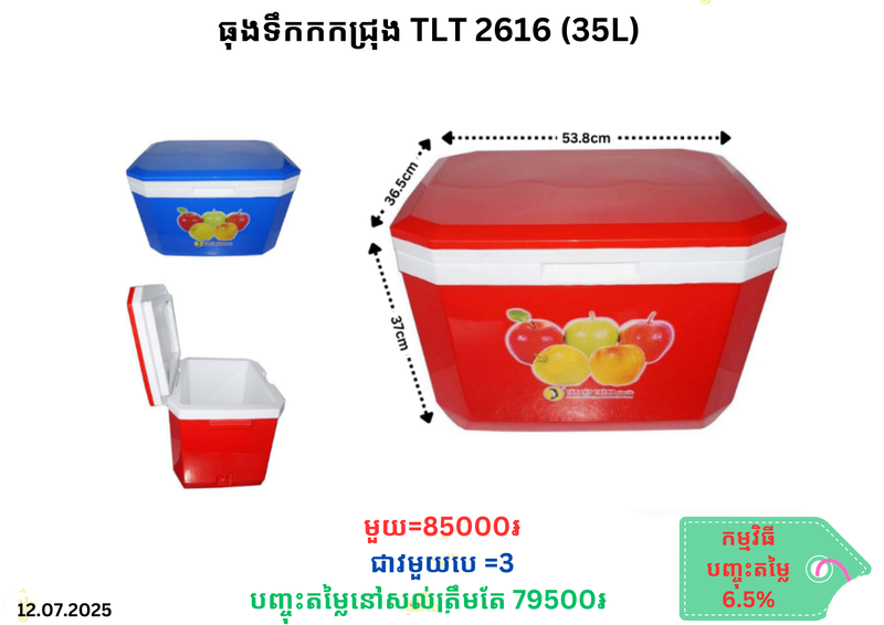 ធុងទឹកកកជ្រុង TLT 2616 (35L) December 19, 2025 Posted in 79500, TLT, ធុងទឹកកក, ធុងទឹកកកជ្រុង, ធុងទឹកកកជ្រុង TLT 📦លេខកូដសម្គាល់ទំនិញ 🆔 Product ID: 8157051 🔣 Barcode / Code: P0007906 📊 ស្ថានភាពស្តុក៖ ជិតអស់ស្តុក