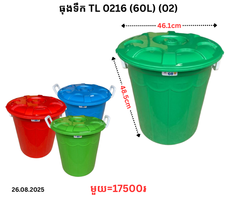 ធុងទឹក TL 0216 (60L) (02) December 24, 2025 Posted in 17500, TL, ធុងទឹក, ធុងទឹក TL Product Code : 0216 📦លេខកូដសម្គាល់ទំនិញ🆔 Product ID: 8521452🔣 Barcode / Code: P0008333📊 ស្ថានភាពស្តុក៖ អស់ស្តុក
