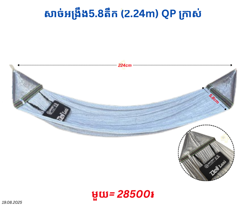 សាច់អង្រឹង5.8តឹក (2.24m) QP ក្រាស់ December 22, 2025 Posted in 28500, QP, សាច់អង្រឹង, សាច់អង្រឹង QP 📦លេខកូដសម្គាល់ទំនិញ 🆔 Product ID: 8488168 🔣 Barcode / Code: P0008253 📊 ស្ថានភាពស្តុក៖ អស់ស្តុក
